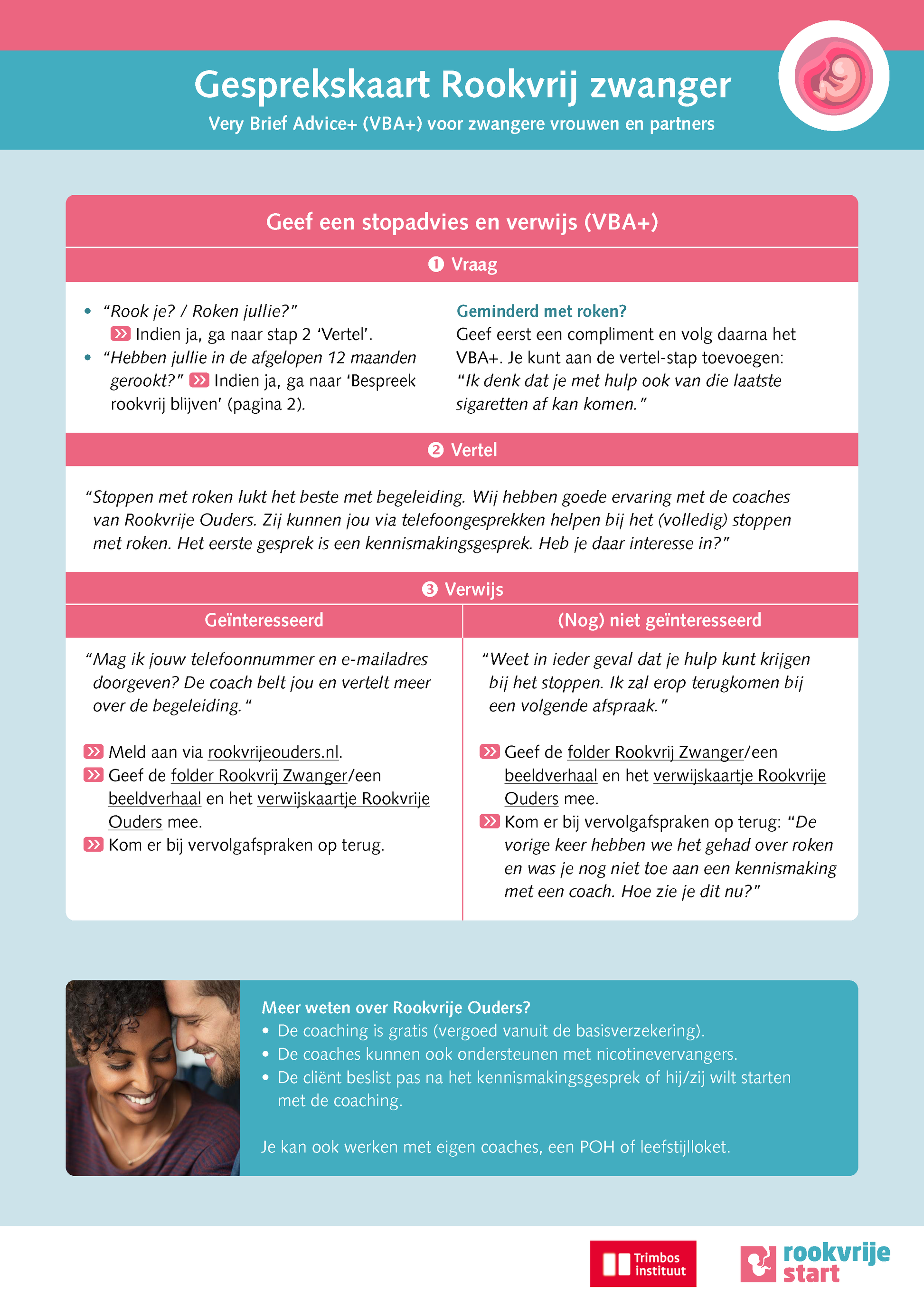 De voorbeeldzinnen in deze gesprekskaart zijn gebaseerd op het Very Brief Advice plus (VBA+) Rookvrije Start. Het VBA+ Rookvrije Start is een stopadvies in 3 stappen: je vraagt, je vertelt en je verwijst.