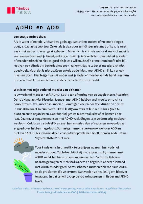 Deze Informatiekaart is onderdeel van de reeks KOPP/KOV Informatiekaarten. De verschillende kaarten bieden kinderen tussen 8 en 14 jaar uitleg over de specifieke psychische ziekte of verslaving van hun ouder. Om het kind te laten merken dat het niet de enige is met zo'n ouder, staat op elke kaart een verhaal van een kind dat zich in dezelfde situatie bevindt.