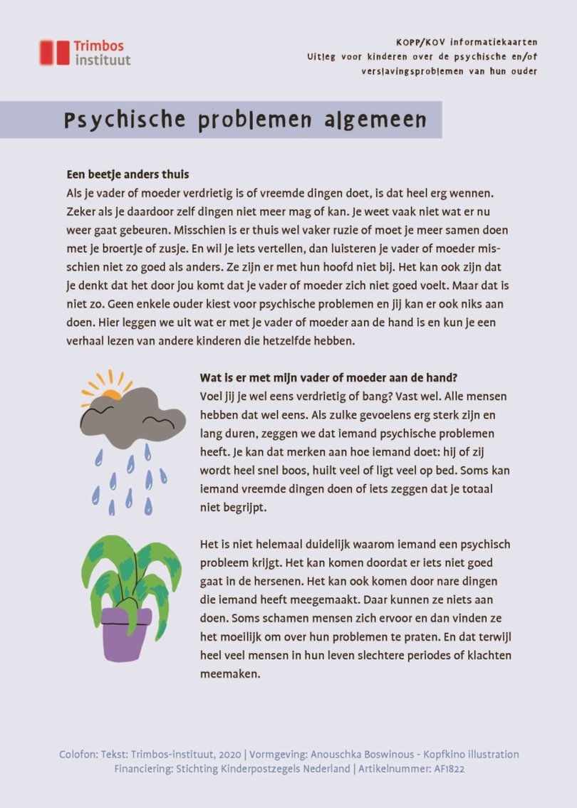 - Psychische problemen algemeen: dit blad is speciaal gemaakt om uitleg te geven in situaties waarin er (nog) geen duidelijke diagnose te stellen is bij de ouder.
