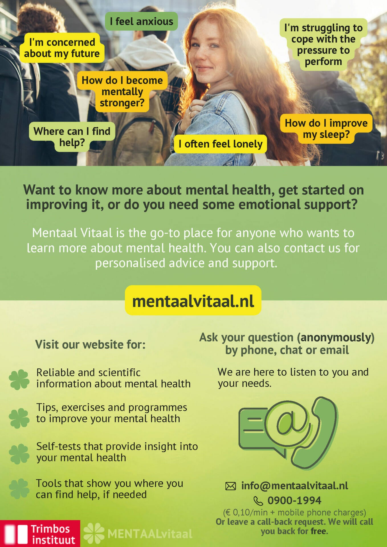 Deze flyer is speciaal ontwikkeld voor jongeren om kennis te maken met Mentaal Vitaal (Publieksinformatie). Het doel van deze flyer is dat jongeren weten waar ze terecht kunnen voor vragen over mentale gezondheid en voor een luisterend oor. De flyer kan worden verspreid op bijvoorbeeld scholen, evenementen of in bibliotheken. Ook kunnen professionals in de geestelijke gezondheidszorg deze flyer meegeven aan jongeren.